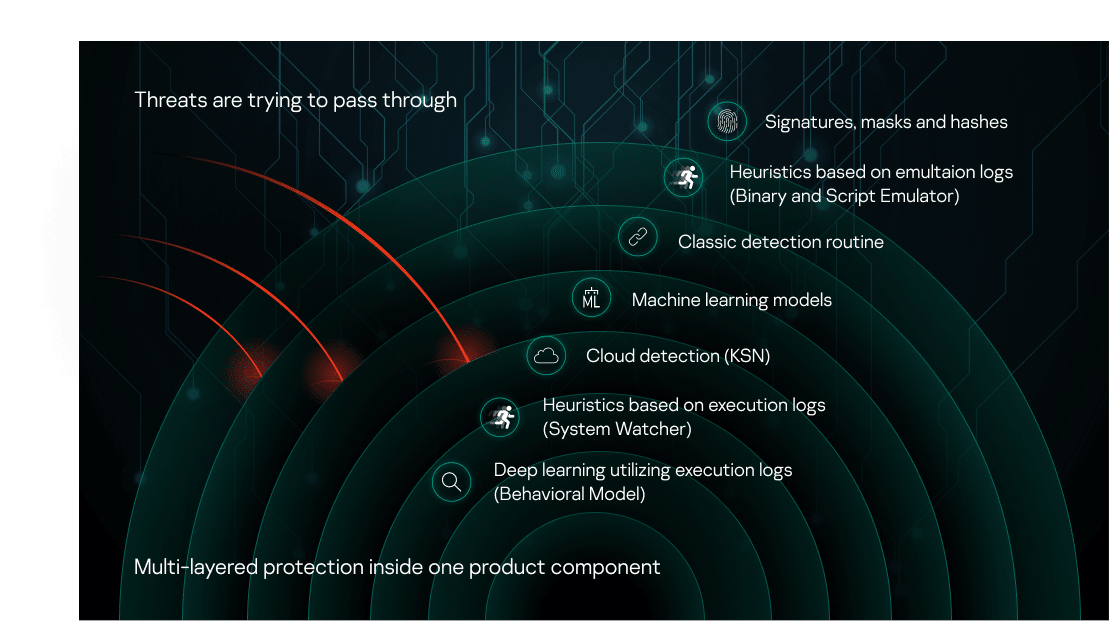 The fifth layer is cloud detection using big data. It leverages threat analytics from all endpoints in Kaspersky Security Network, which, in turn, enables unprecedented reaction to new threats and minimizing false positives.